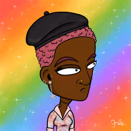 Collection Depressed Citizens Artist Juls Description ART. No team, no project, no future. Depressed Citizens is an urban & existential Art expression on Ordinals. In a parallel universe, "THEI" control us. DC unites against toxic society, encouraging critical thinking. 100% hand made collection that took Juls more than 6 months of daily work. Name Citizen#354 Origin LGBT-Q+ Gender Woman Necklace Choker Hat Black beret Mustache Beard No beard Glasses No Glasses Earrings Upper lobe rings Hair Style Short tight curls Clothes Artsy pink shirt Tattoo Rose tattoo Star Background With stars