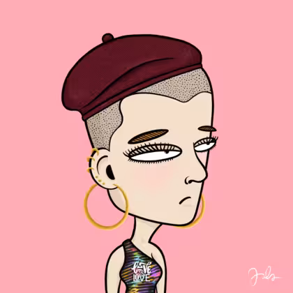 Collection Depressed Citizens Artist Juls Description ART. No team, no project, no future. Depressed Citizens is an urban & existential Art expression on Ordinals. In a parallel universe, "THEI" control us. DC unites against toxic society, encouraging critical thinking. 100% hand made collection that took Juls more than 6 months of daily work. Name Citizen#1342 Origin Caucasian non hispanic Gender Woman Necklace No Necklace Hat Burgundy beret Mustache Beard No beard Glasses No Glasses Earrings Helix ring trio Hair Style Shaved head Clothes Love is love one shoulder crop Tattoo No Tattoo Star Background Without stars