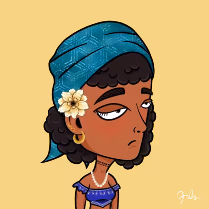 Collection Depressed Citizens Artist Juls Description ART. No team, no project, no future. Depressed Citizens is an urban & existential Art expression on Ordinals. In a parallel universe, "THEI" control us. DC unites against toxic society, encouraging critical thinking. 100% hand made collection that took Juls more than 6 months of daily work. Name Citizen#2924 Origin Asian & Pacific islander Gender Woman Necklace Choker Hat Printed head scarf Mustache Beard No beard Glasses No Glasses Earrings Upper lobe strass Hair Style Curly Clothes Blue bandana crop top Tattoo No Tattoo Star Background Without stars