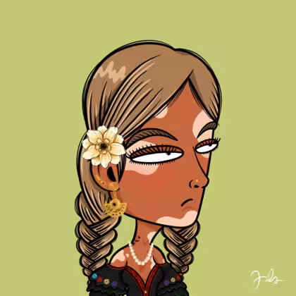 Collection Depressed Citizens Artist Juls Description ART. No team, no project, no future. Depressed Citizens is an urban & existential Art expression on Ordinals. In a parallel universe, "THEI" control us. DC unites against toxic society, encouraging critical thinking. 100% hand made collection that took Juls more than 6 months of daily work. Name Citizen#1163 Origin Unique Gender Woman Necklace Pearl necklace Hat No Hat Mustache Beard No beard Glasses No Glasses Earrings Upper lobe strass Hair Style Double braids Clothes Traditional black flowery dress Tattoo Rose tattoo Star Background Without stars
