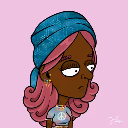 Collection Depressed Citizens Artist Juls Description ART. No team, no project, no future. Depressed Citizens is an urban & existential Art expression on Ordinals. In a parallel universe, "THEI" control us. DC unites against toxic society, encouraging critical thinking. 100% hand made collection that took Juls more than 6 months of daily work. Name Citizen#298 Origin African descendant Gender Woman Necklace Colorful layered necklace Hat Printed head scarf Mustache Beard No beard Glasses No Glasses Earrings Tragus star earring Hair Style Long wavy Clothes Peace crop top Tattoo Rose tattoo Star Background Without stars
