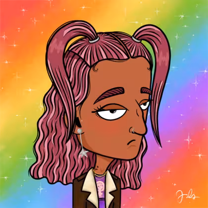 Collection Depressed Citizens Artist Juls Description ART. No team, no project, no future. Depressed Citizens is an urban & existential Art expression on Ordinals. In a parallel universe, "THEI" control us. DC unites against toxic society, encouraging critical thinking. 100% hand made collection that took Juls more than 6 months of daily work. Name Citizen#599 Origin LGBT-Q+ Gender Non-binary Necklace Gold layered necklace Hat No Hat Mustache Beard No beard Glasses No Glasses Earrings Star earring set Hair Style Long wavy with space ponytails Clothes Women power long-sleeve shirt Tattoo Rose tattoo Star Background With stars