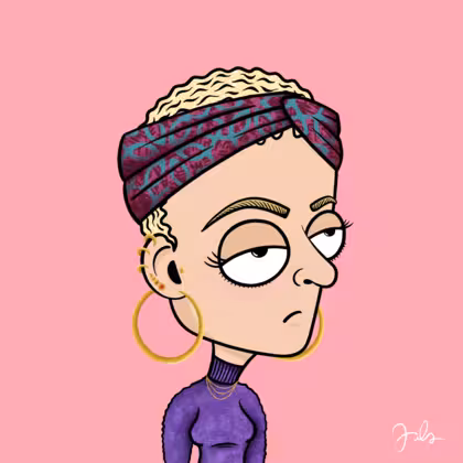 Collection Depressed Citizens Artist Juls Description ART. No team, no project, no future. Depressed Citizens is an urban & existential Art expression on Ordinals. In a parallel universe, "THEI" control us. DC unites against toxic society, encouraging critical thinking. 100% hand made collection that took Juls more than 6 months of daily work. Name Citizen#2577 Origin Caucasian non hispanic Gender Woman Necklace Gold layered necklace Hat Printed headband Mustache Beard No beard Glasses No Glasses Earrings Tragus star earring Hair Style Short curly with gel Clothes Purple turtleneck sweater Tattoo No Tattoo Star Background Without stars